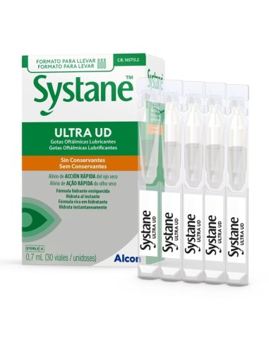 Systane Ultra UD, 30 monodosis de gotas oftálmicas lubricantes, puede utilizarse para lubricar y humectar cada día las lentes de contacto blandas (hidrofílicas) y de hidrogel de silicona, desechables y de uso prolongado.
